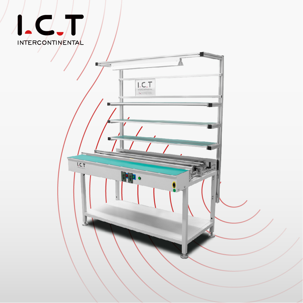 I.C.T は 10 種類以上のコンベヤ タイプを提供しているため、どの工場も完璧に稼働します。標準の連結コンベヤは基板を搬送するだけです。検査ステーションには明るい照明が追加されます。伸縮ユニットとリジェクトユニットは特殊なレイアウトに適合します。高度な SMT PCB シーリング コンベヤー には、手動カバー、自動リフト カバー、シングルまたはデュアル レーン バージョンが付属しており、超クリーン環境用のオプションのエア シャワーまたはイオナイザーも付属しています。強力チェーンやバッファリングモデルもございます。すべての コンベヤー PCB 組立ラインは、お客様の正確な清浄度要件に合わせて、長さ、高さ、カバーのタイプ、スマート機能を完全にカスタマイズできます。