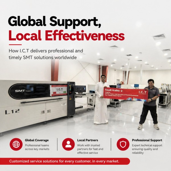 サウジアラビアのような市場では、地元の SMT 業界の専門知識が限られている可能性があり、I.C.T は包括的な技術サポートを提供するために介入します。当社のチームは設置、トレーニング、トラブルシューティングに全責任を負い、お客様が当社の専門家から直接、プロフェッショナルでタイムリーなサービスを受けられるようにします。